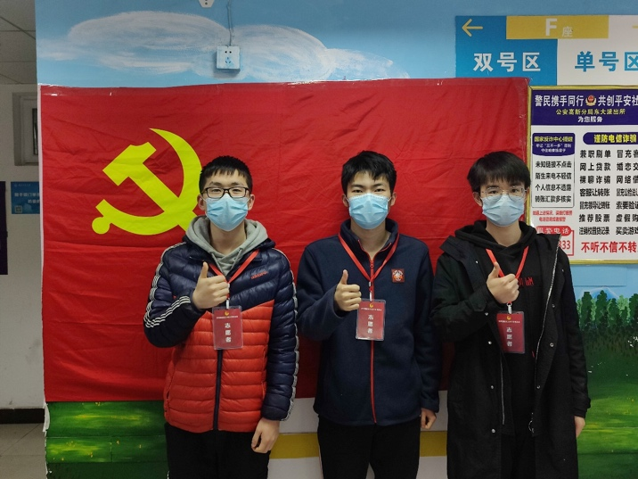 战硕等三位同学来自本科生2019级党支部,党员战硕、郑贺源,发展对象申延均为云天苑F座志愿者队伍的重要成员。抗疫期间,他们担任楼层负责人,保证核酸检测通知到户,搬运分发餐食物资,统计每天用餐情况等,即使时常早起晚归,即使历经凛冽寒风,他们始终积极热情地为大家提供服务,保障更完善的物资供应和更便利的生活。在疫情形势有所好转后他们也仍然坚守在一线,一有通知立刻响应,为学校的抗疫工作贡献自己的一份力量。他们说:“我们在这个寒冬见证了太多温暖与感动,也相信在每个工作者的辛勤付出和同学们的积极配合下,这场战‘疫’终能大获全胜。”