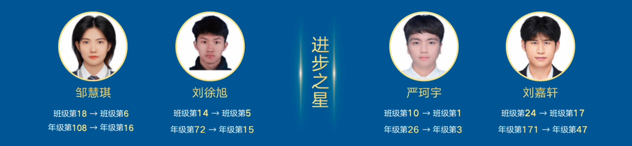 “雄关漫道真如铁,而今迈步从头越”是敢于冲破逆境,用于开拓荒原的10011907班同学们耳濡目染的座右铭。严珂宇、刘嘉轩、刘徐旭、邹慧琪四位同学的学业成绩较上年大幅提高,从班级第十到班级第一,再到年级内超100名的大幅进步,展现了7班同学拼搏进取的精神风貌。