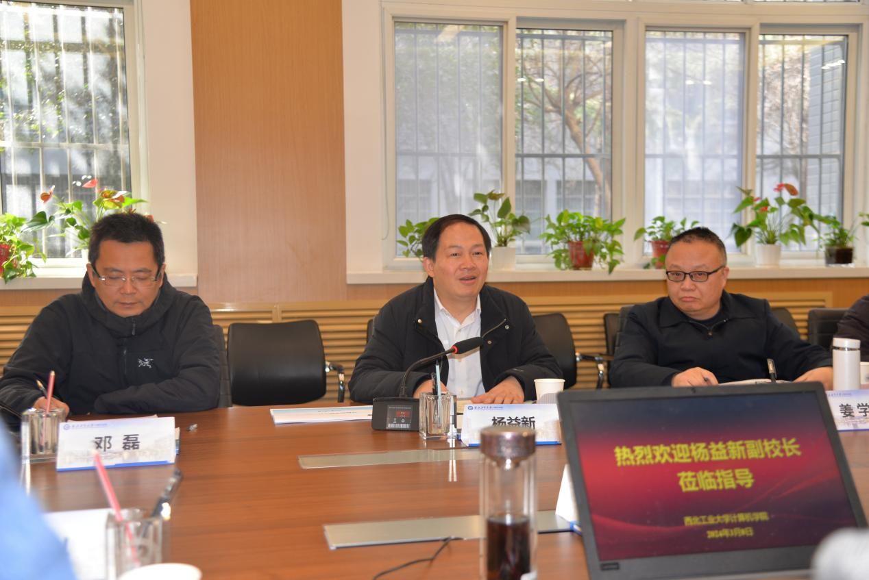调研汇报结束后,杨益新进行了总结指导。他说,从今年元月份起,自己开始联系威廉希尔williamhill,虽然以前对学院的情况也比较了解,但今天是第一次全面深入调研。对学院近年来的快速发展和各个方面取得的突出成绩非常认可,也衷心感谢大家和全体师生。现在全校都在聚焦“127”目标,谋划奋进新征程,希望和大家一起努力,一是强化学科专业特色,打造西工大计算机学科名片;二是筑牢总师育人特色,着力培养有影响力的领军人才;三是建好实验平台,提升信息类学科实验室展示度;四是优化人才队伍结构,提升行业影响力;五是以重大项目落地为抓手,深化学院和科研院所、企业深度合作,持续推进学院高质量内涵式发展。