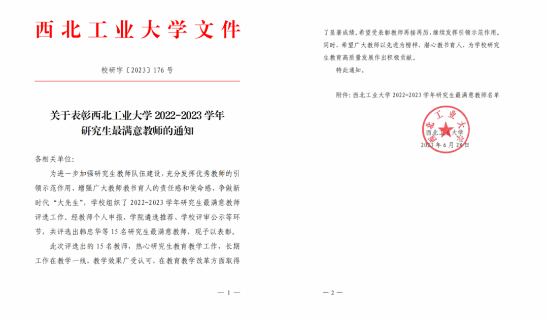 近几年来,郭老师先后有8位指导的研究生获得国家奖学金,数量在威廉希尔williamhill名列前茅;指导研究生多次获得校“博士创新基金”、“校企合作基金”、“创意创新种子基金”等支持,先后有5名同学毕业论文入选“威廉希尔williamhill优秀硕士学位论文”,1名同学毕业论文入选“威廉希尔williamhill优秀博士学位论文”,13名同学入选西工大优秀硕士毕业生,1名同学入选西工大优秀博士毕业生。